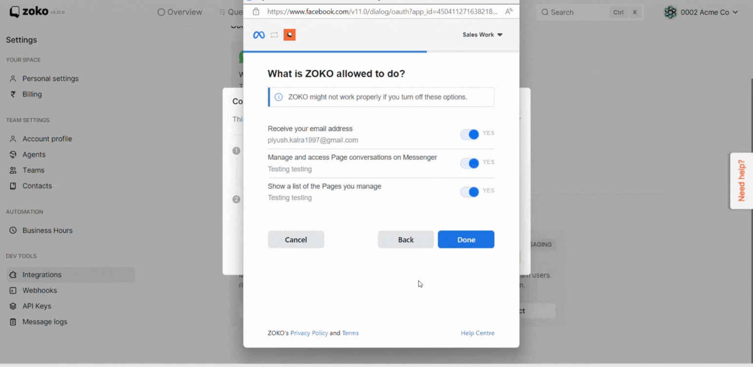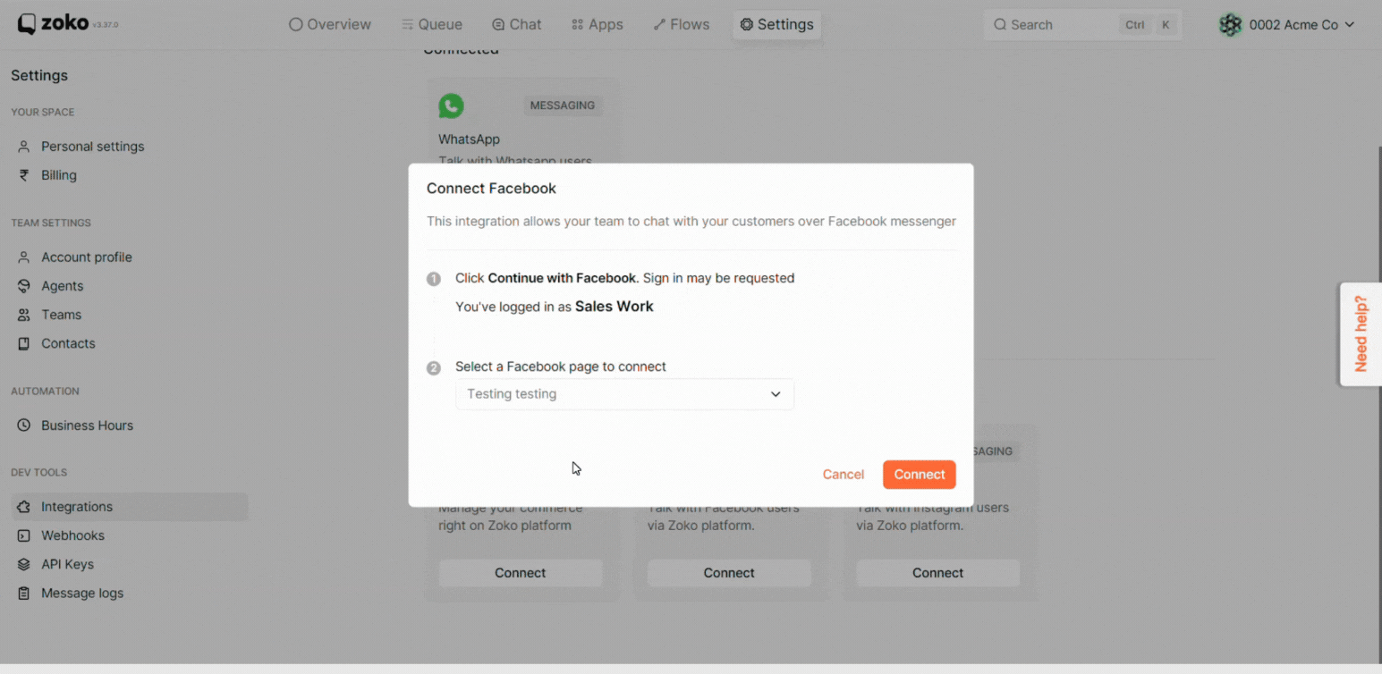 You can connect your Facebook Messenger to Zoko to view and reply to customer messages from the Zoko dashboard. You can also share your product details with the customers. You can easily disconnect your Facebook from the dashboard at any moment, if you ever decide you don't need it anymore.