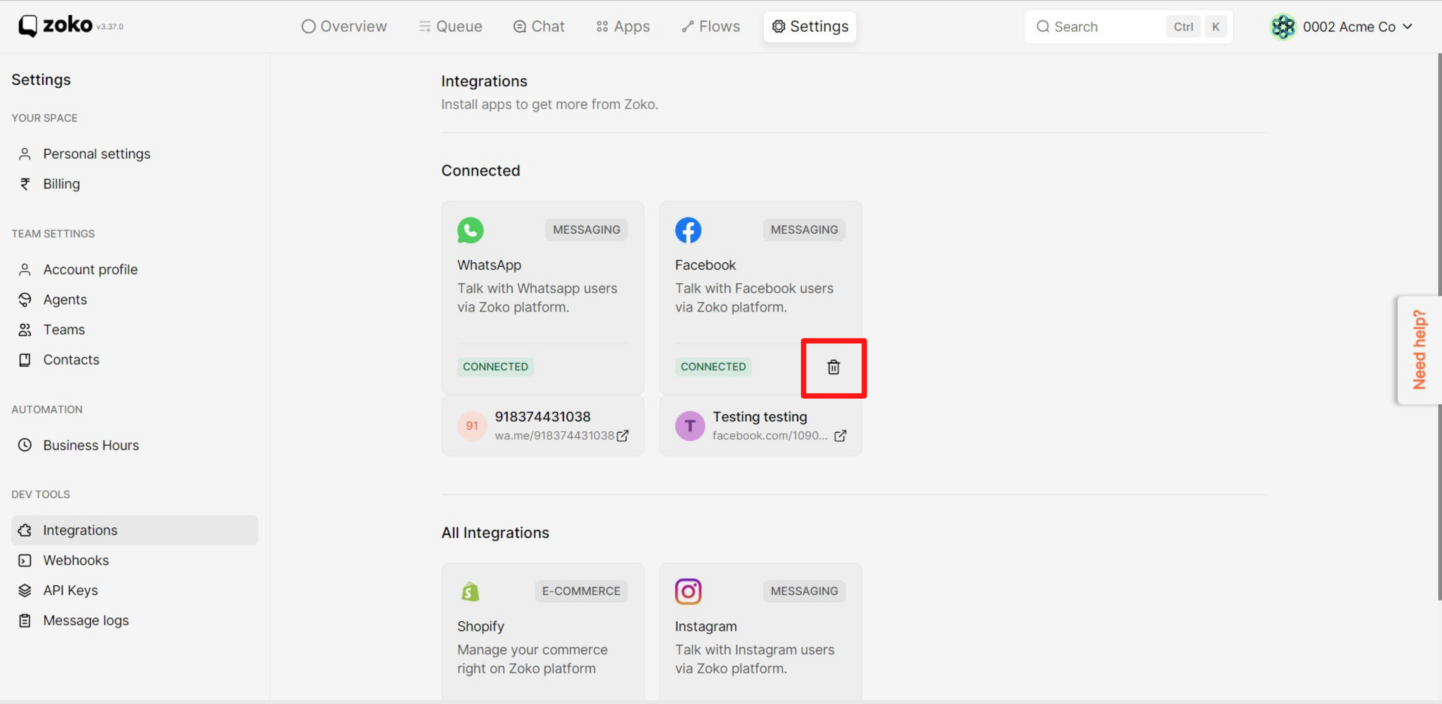 8. You can disconnect the Facebook integration by clicking on the Delete button.