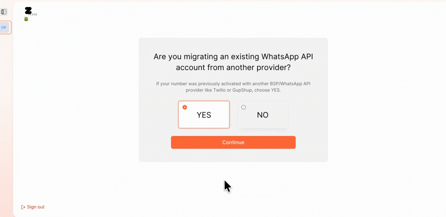 3. If the number you wish to connect to Zoko was already on WhatsApp API through another provider (like Twilio or Gupshup), choose YES. Otherwise, select NO. In our case, we selected NO and click on Continue.