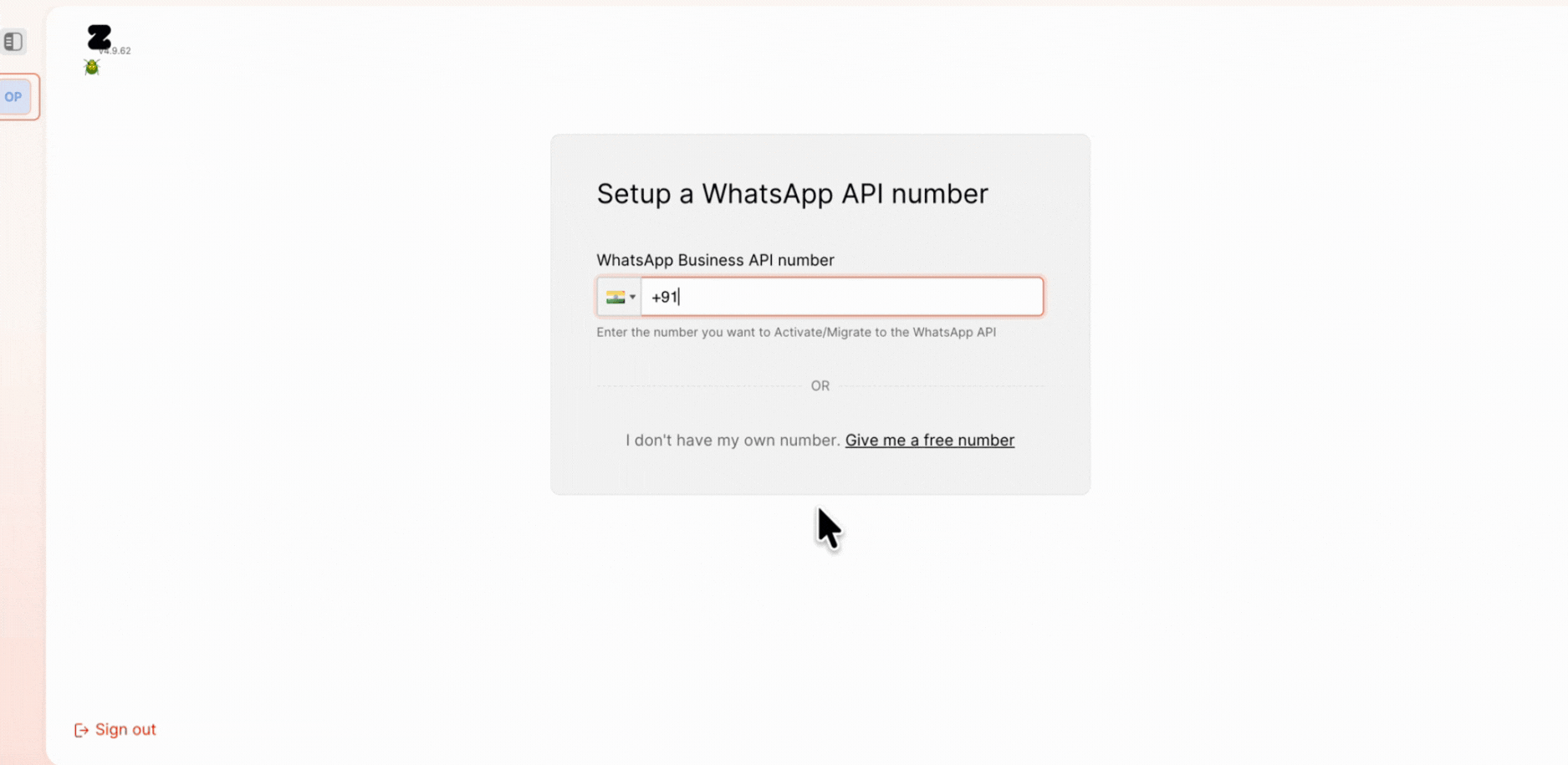 4. Enter the phone number you want to register for WhatsApp API or if you don't have one, you can select Give me a free number, which will generate a virtual US number you can use.