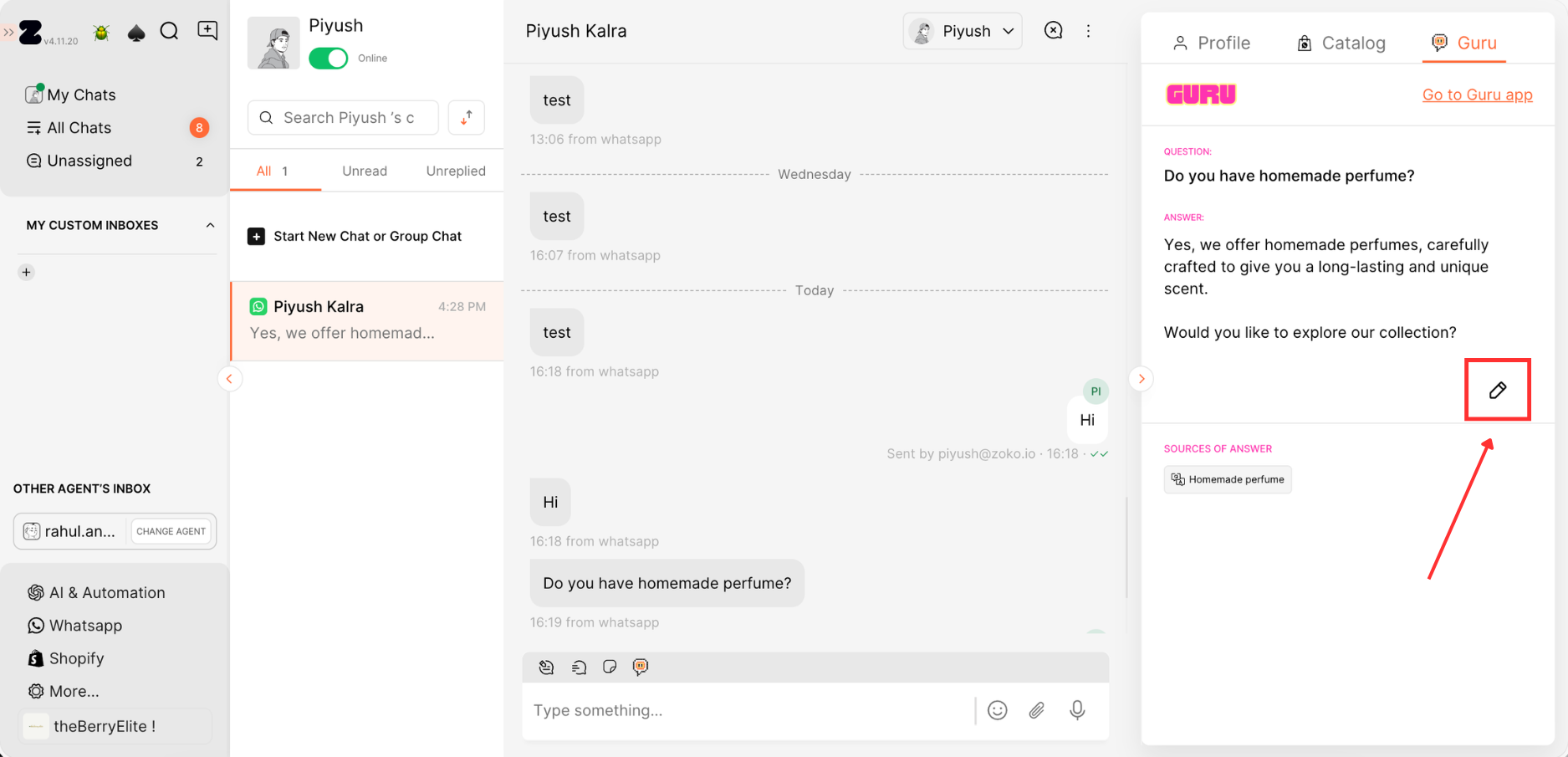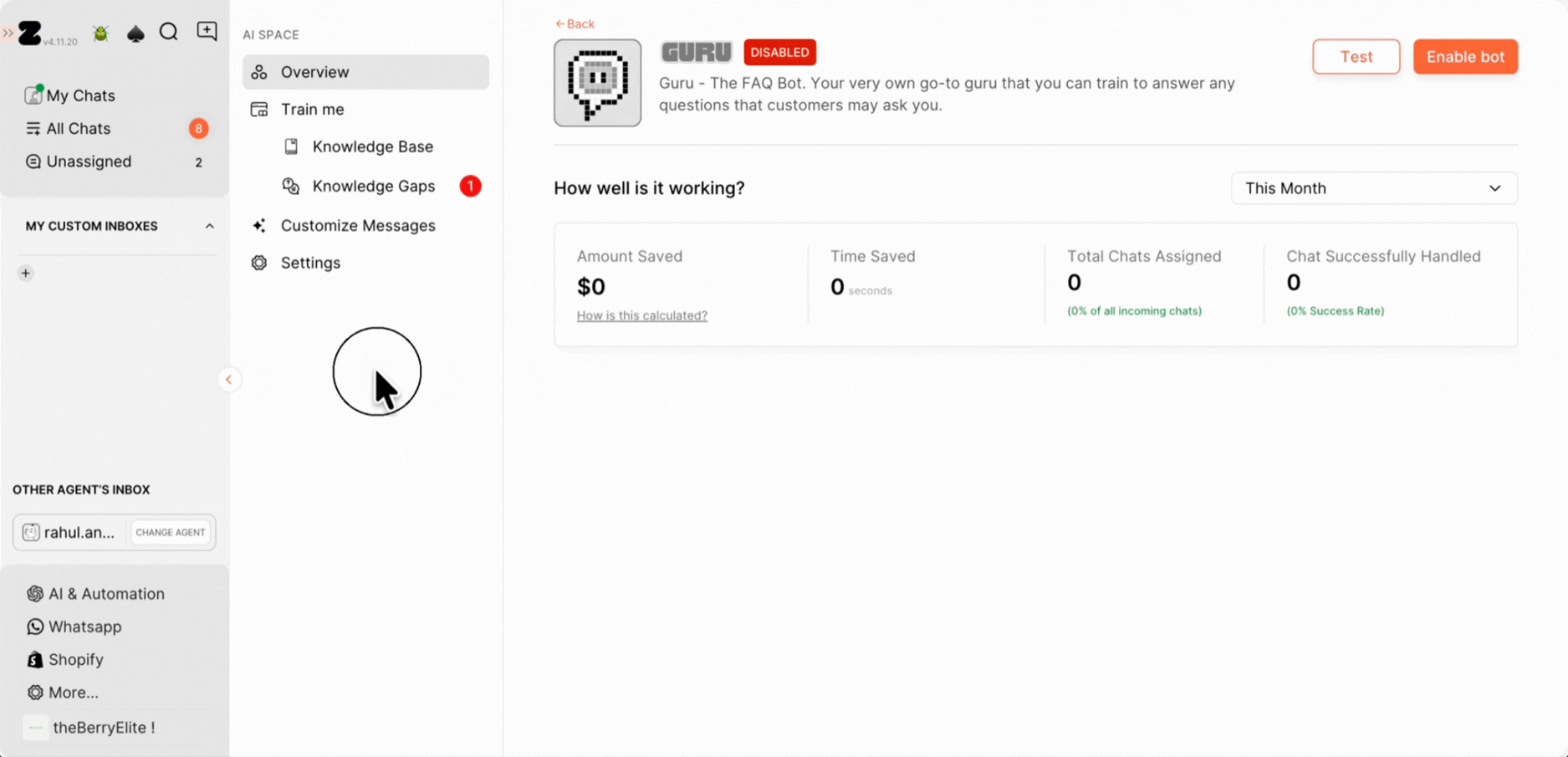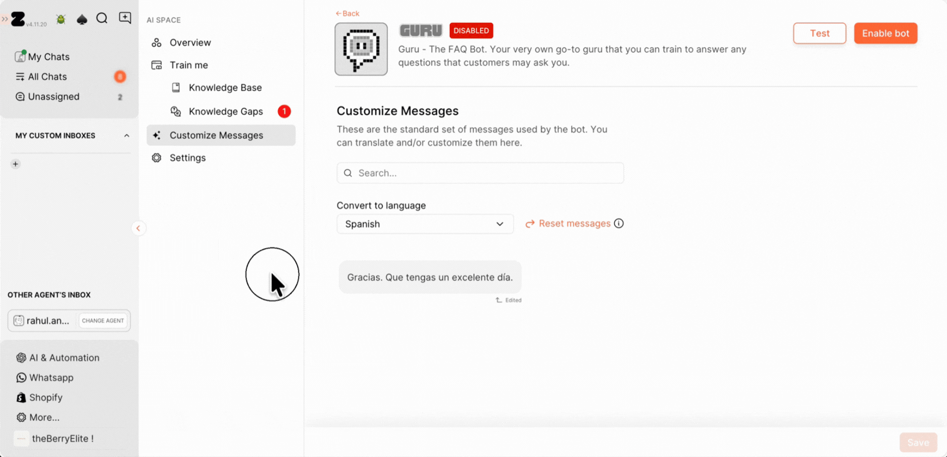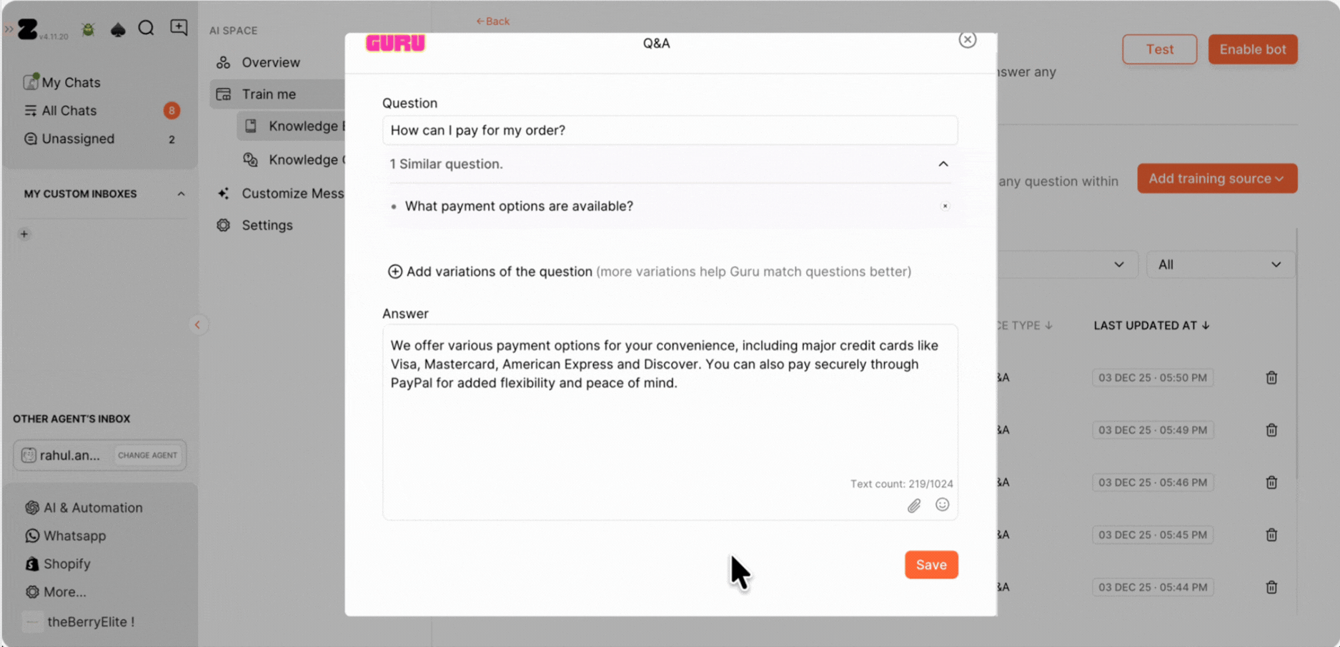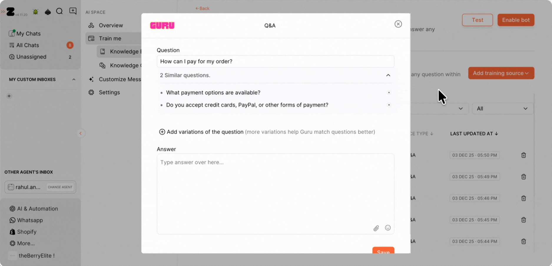 13. Alternatively, you can easily train the Q&A to bot right from the chat screen. Just open the chat and look at the customer queries. Hover over them to find the Train icon, then click it to see options on the right side.