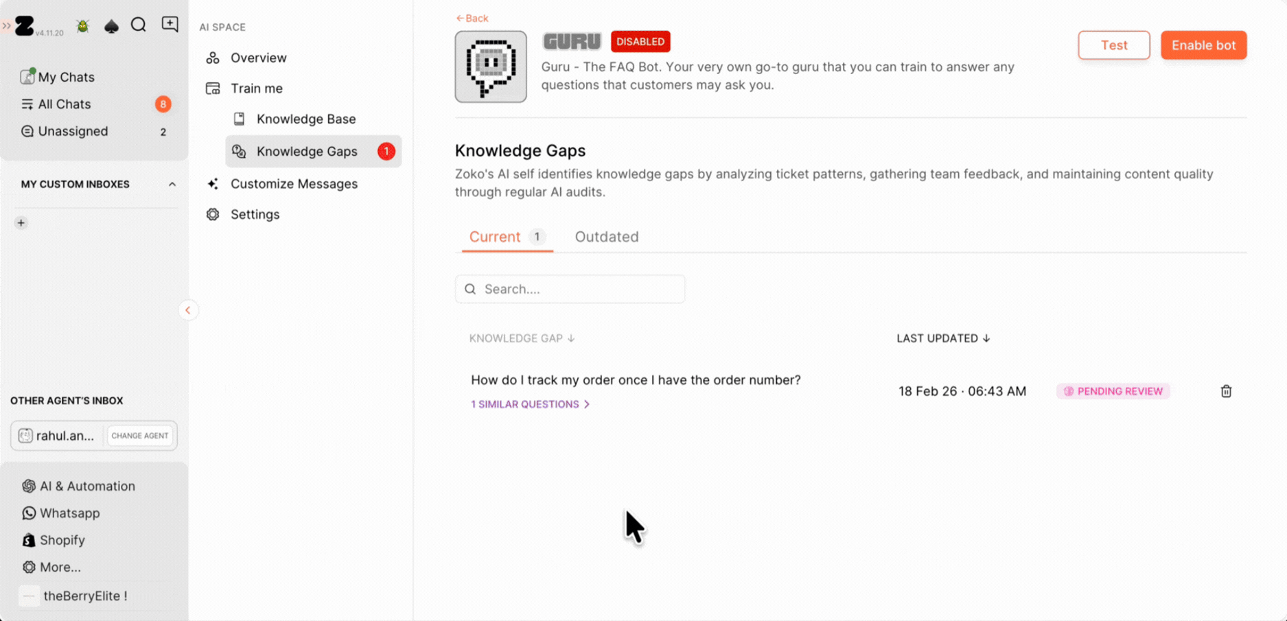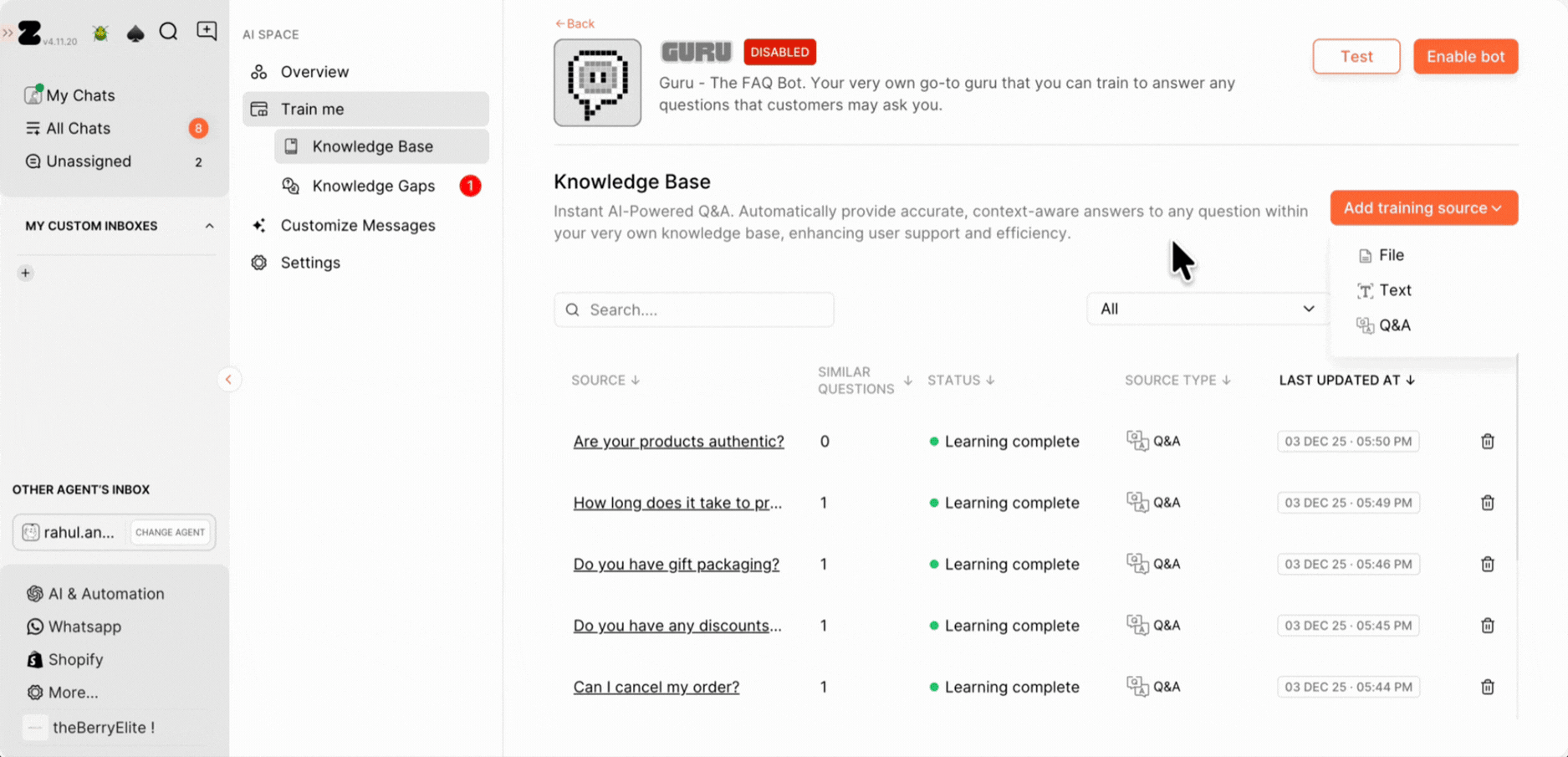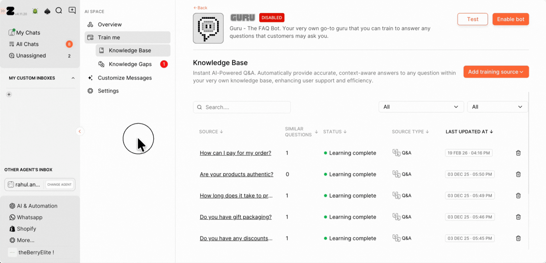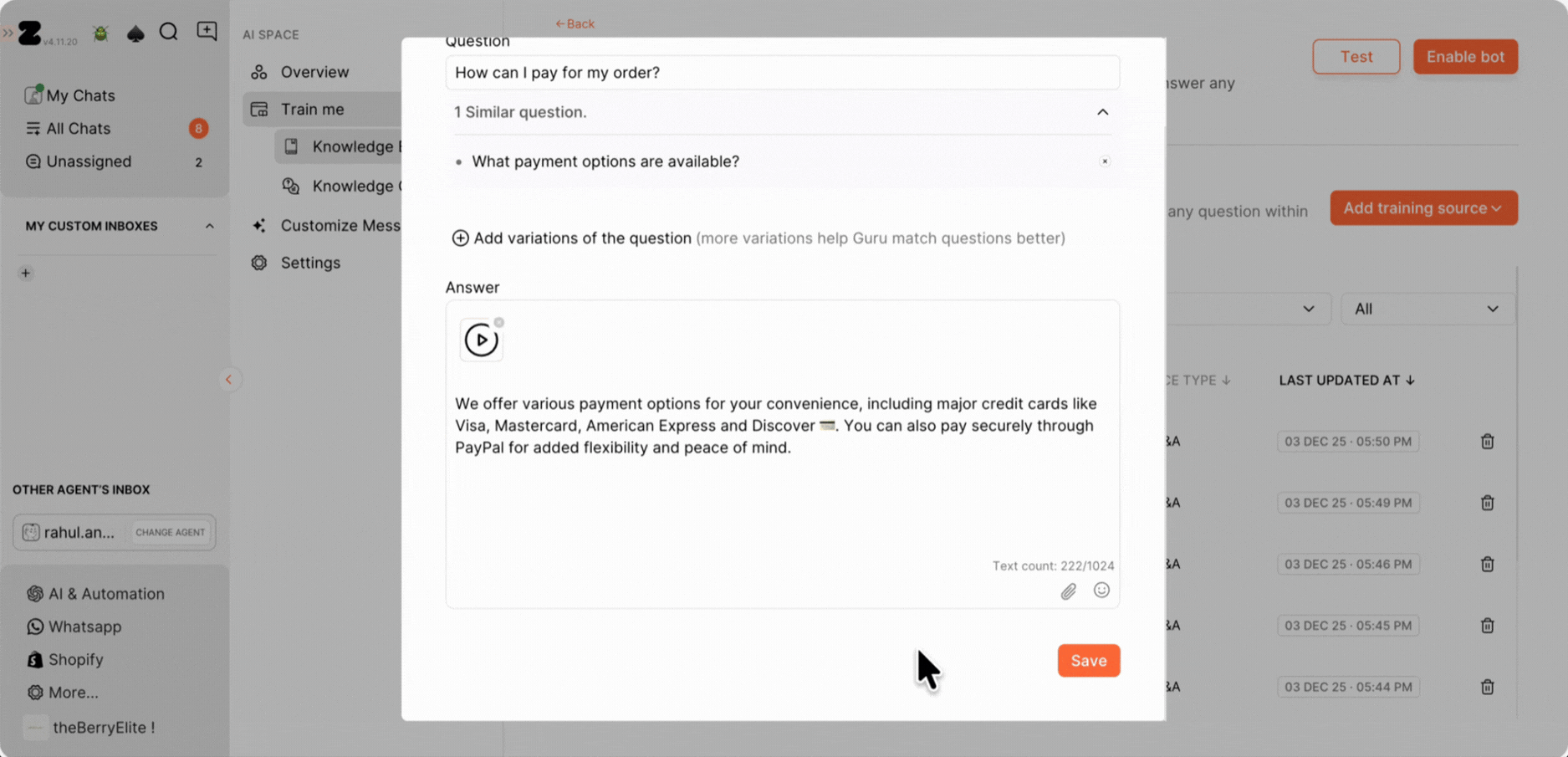 1. Alternatively, you can train the Q&A directly from the chat screen. Just open a customer conversation, hover over the customer’s query to find the Train icon, and click on it to view the answer options on the right side.