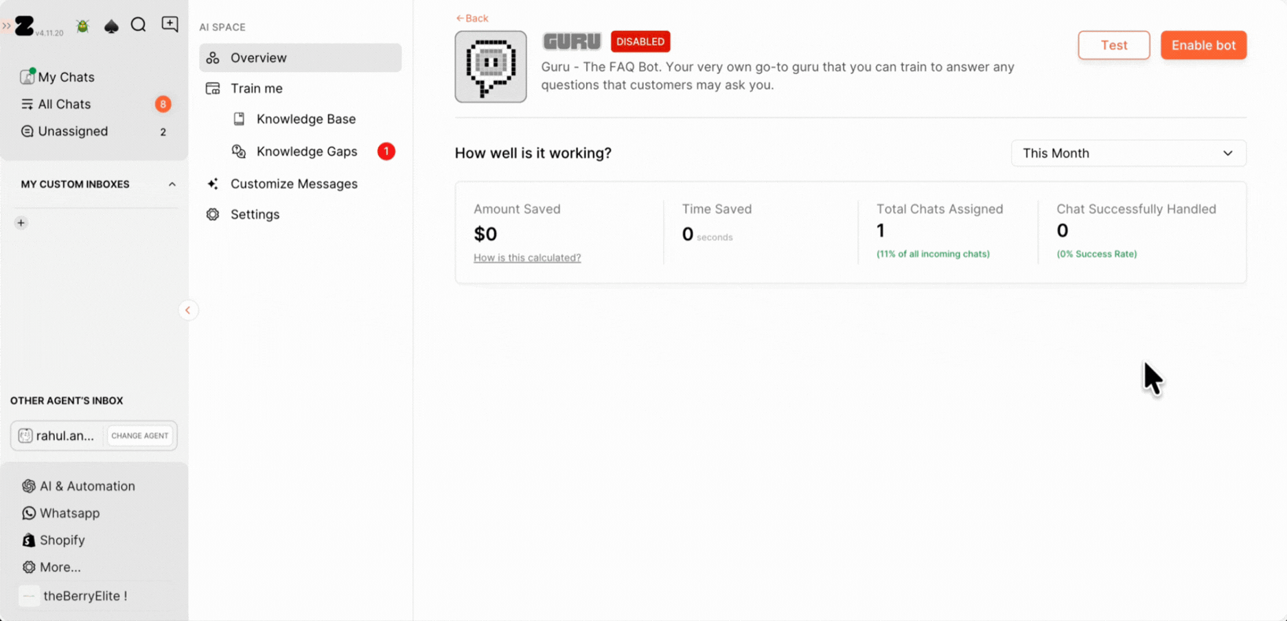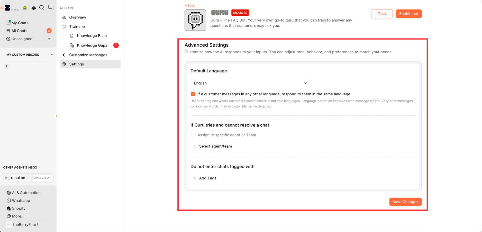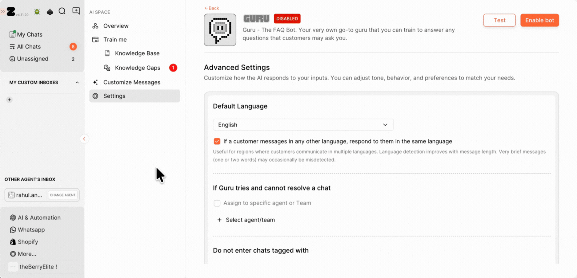 - If Guru can’t resolve a conversation, enable chat assignment.