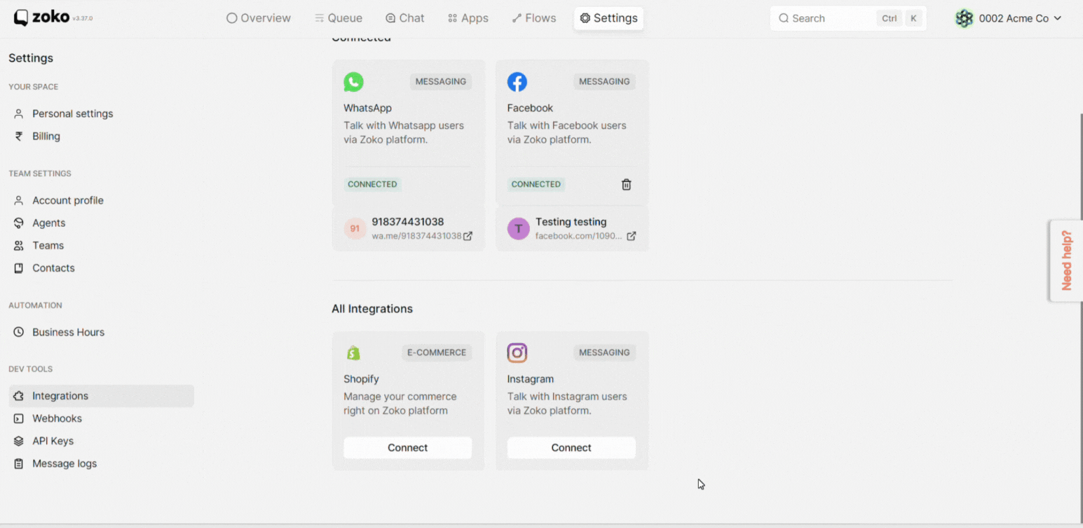 After successfully connecting Facebook, you can now proceed to connect your Instagram account on Zoko. Follow these steps: