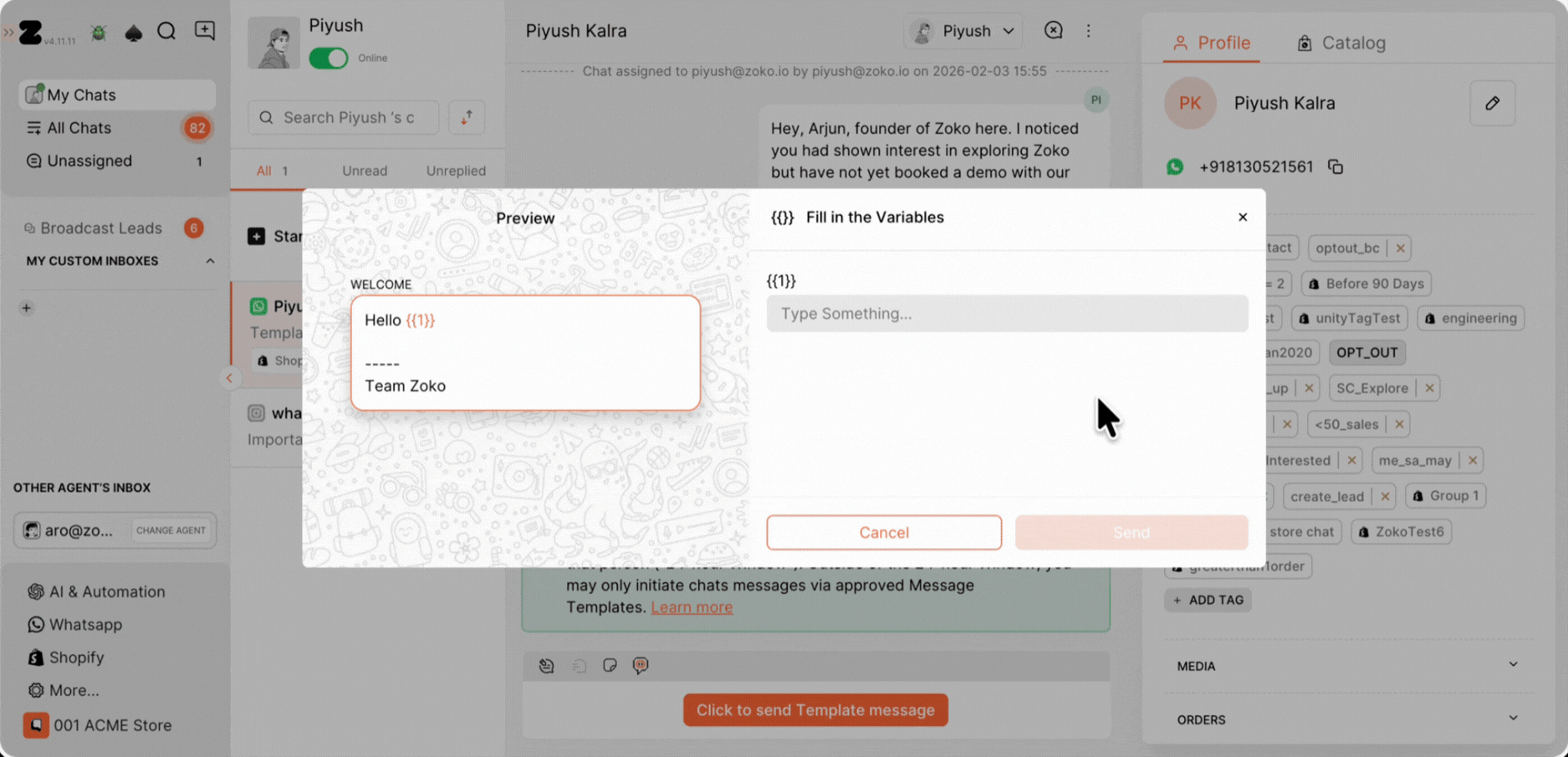 3. You can type the message in the variable {{1}} and hit the Send button.