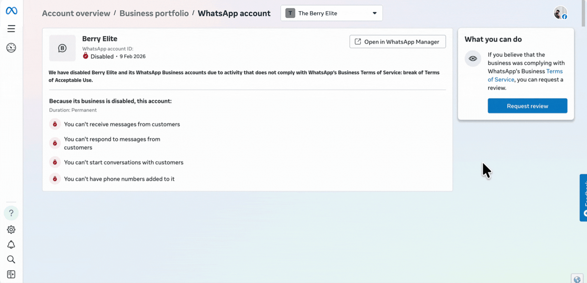 - The account did not comply with WhatsApp Business Terms of Service or Acceptable Use Policy.