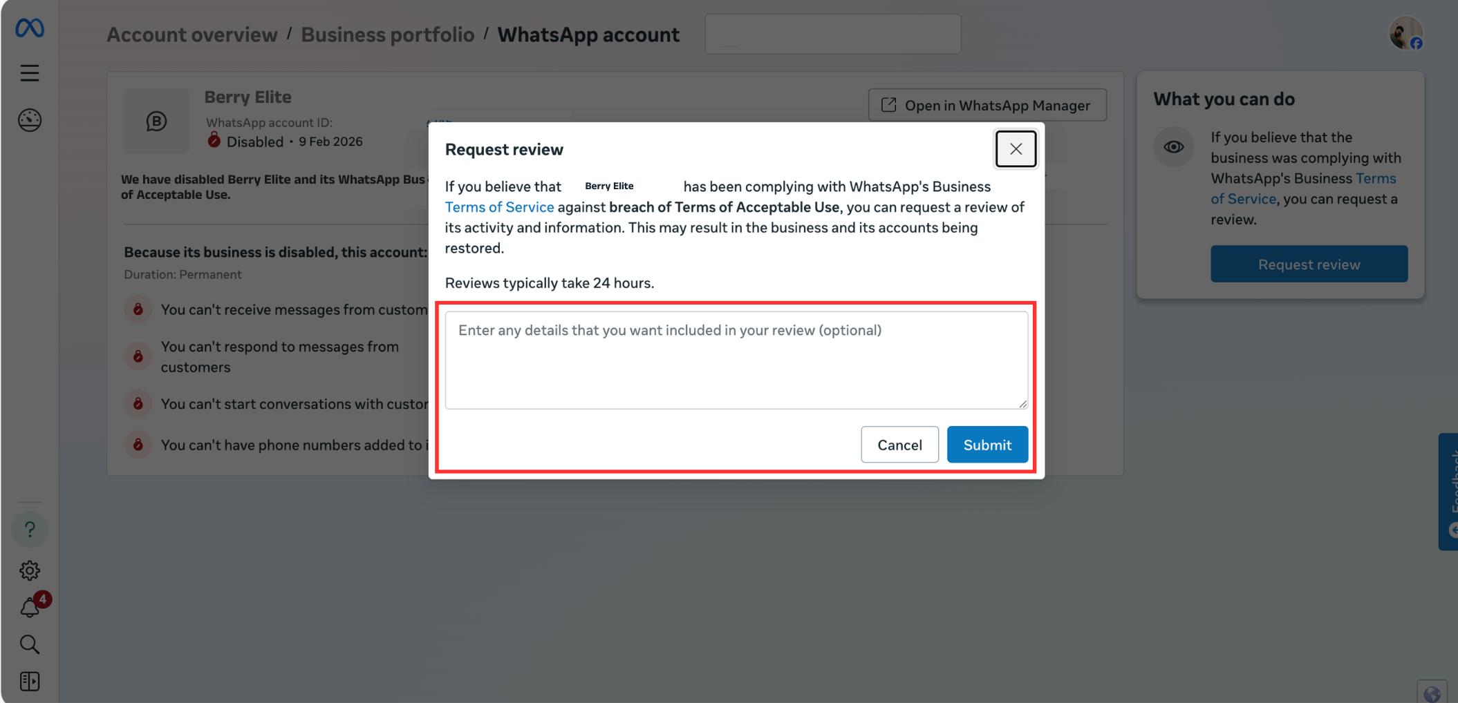 Note: Meta will review your request within 24 hours and notify you via email with the decision.