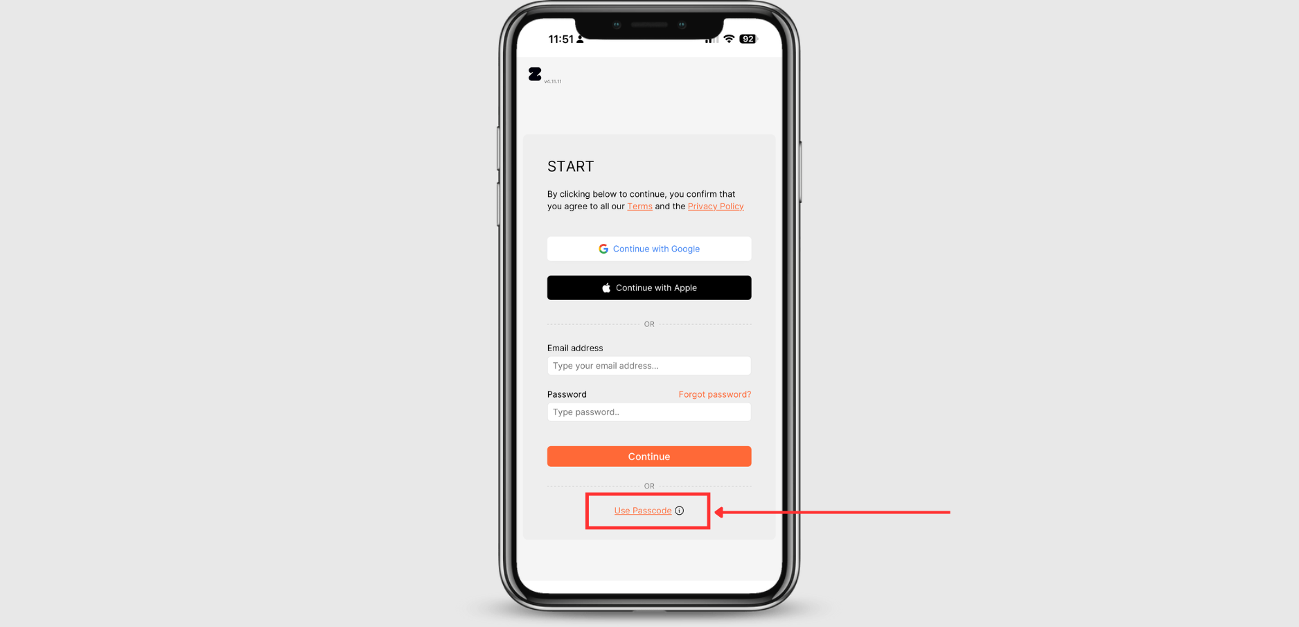 Note: You don’t need to enter your email and password again, just click on Use Passcode and paste it.