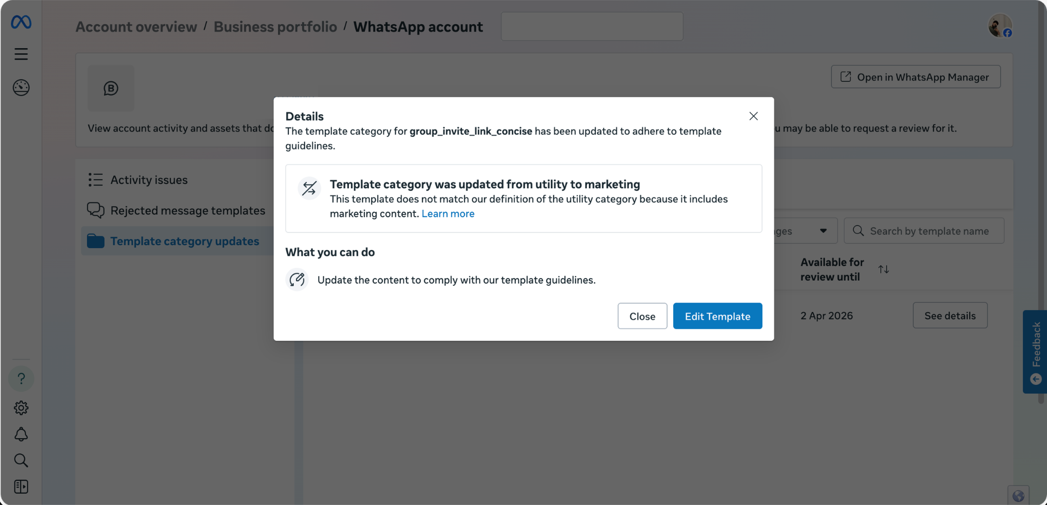 If your WhatsApp message template has been automatically recategorised by WhatsApp, it means Meta believes the template fits better under a different category than the one you originally selected.