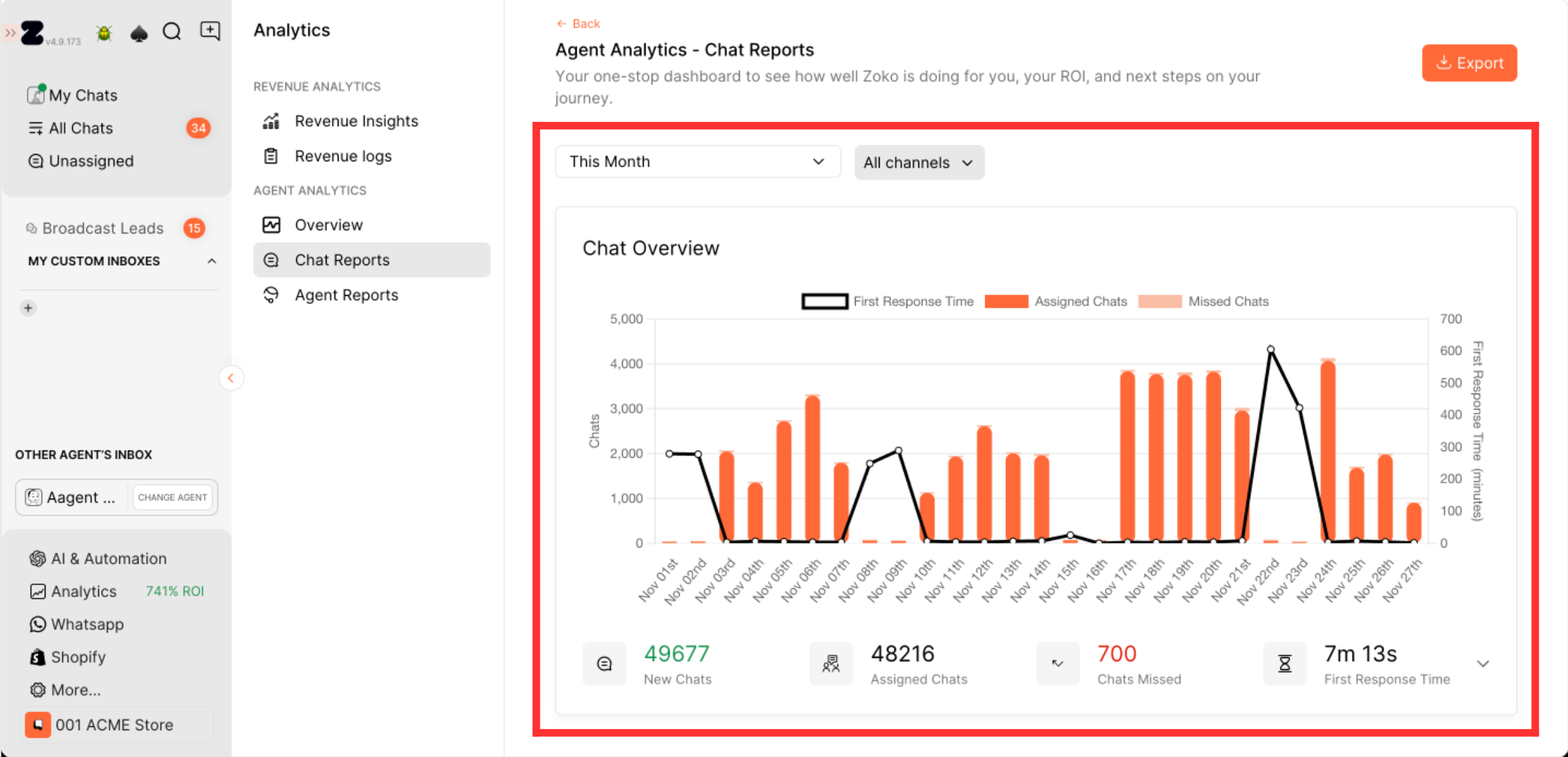 1. Go to the Analytics section to find everything in one place (Revenue insights, Revenue logs, Overview, Chat reports and Agent reports).