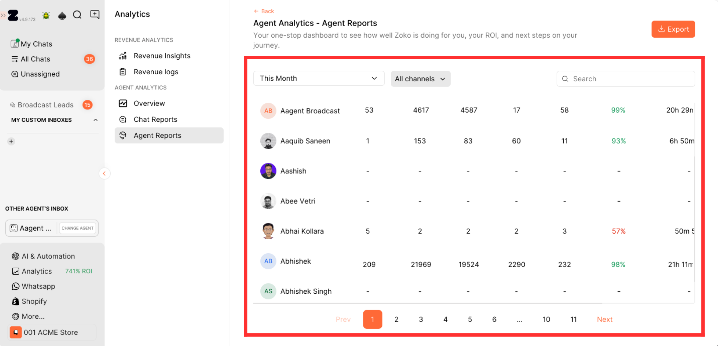 Agent Reports offer insights to track and understand the performance of your agents. Within your selected timeframe, the following metrics are provided for each agent, giving you the flexibility to fine-tune the report based on specific dates, options include today, this month, and the current week. Moreover, you can filter the report by channel, selecting platforms like WhatsApp, Instagram, and Facebook based on your preference.