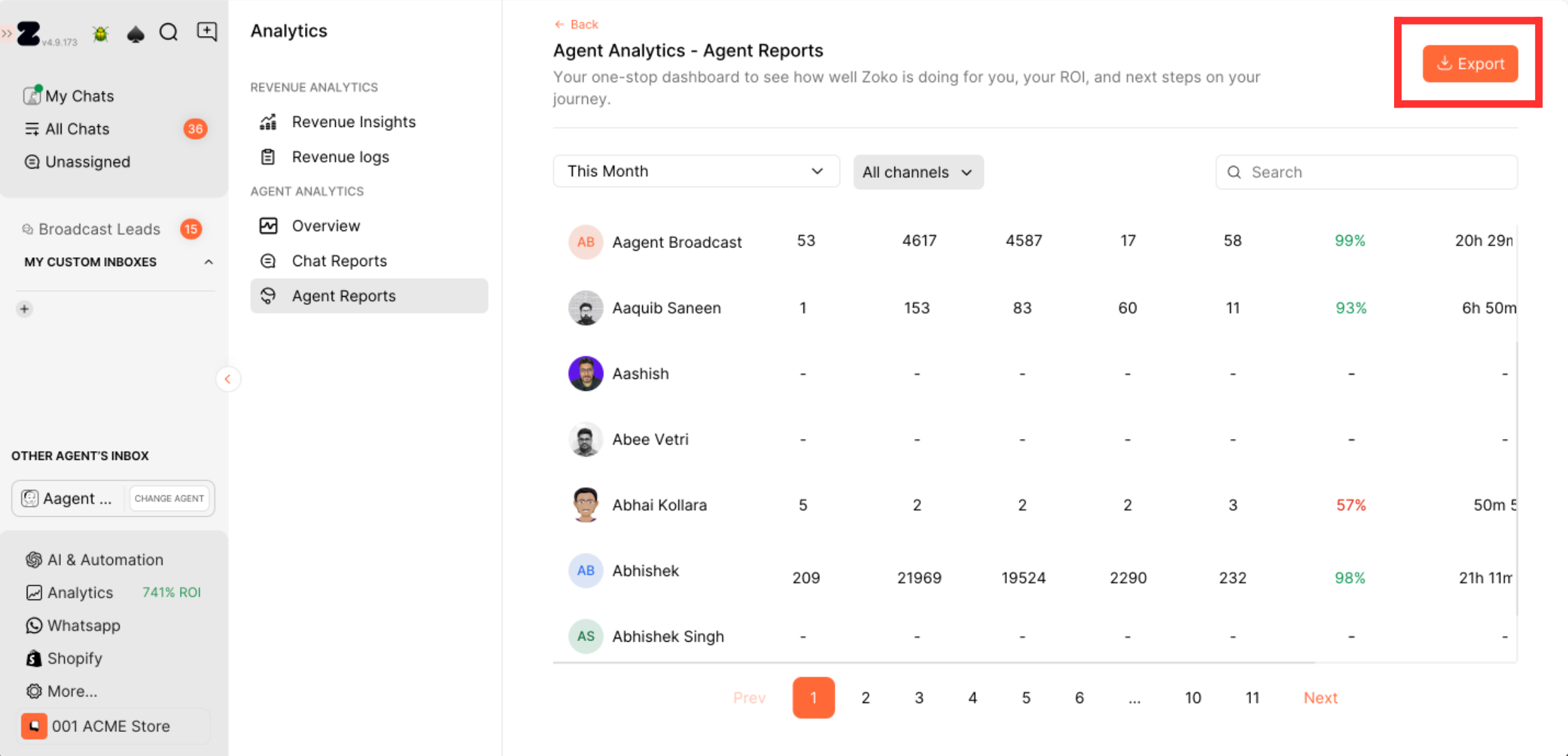You also have the option to export the chat reports and agent reports based on the page you are currently viewing. Simply click on the "Export" button on that page, and it will download the file.
