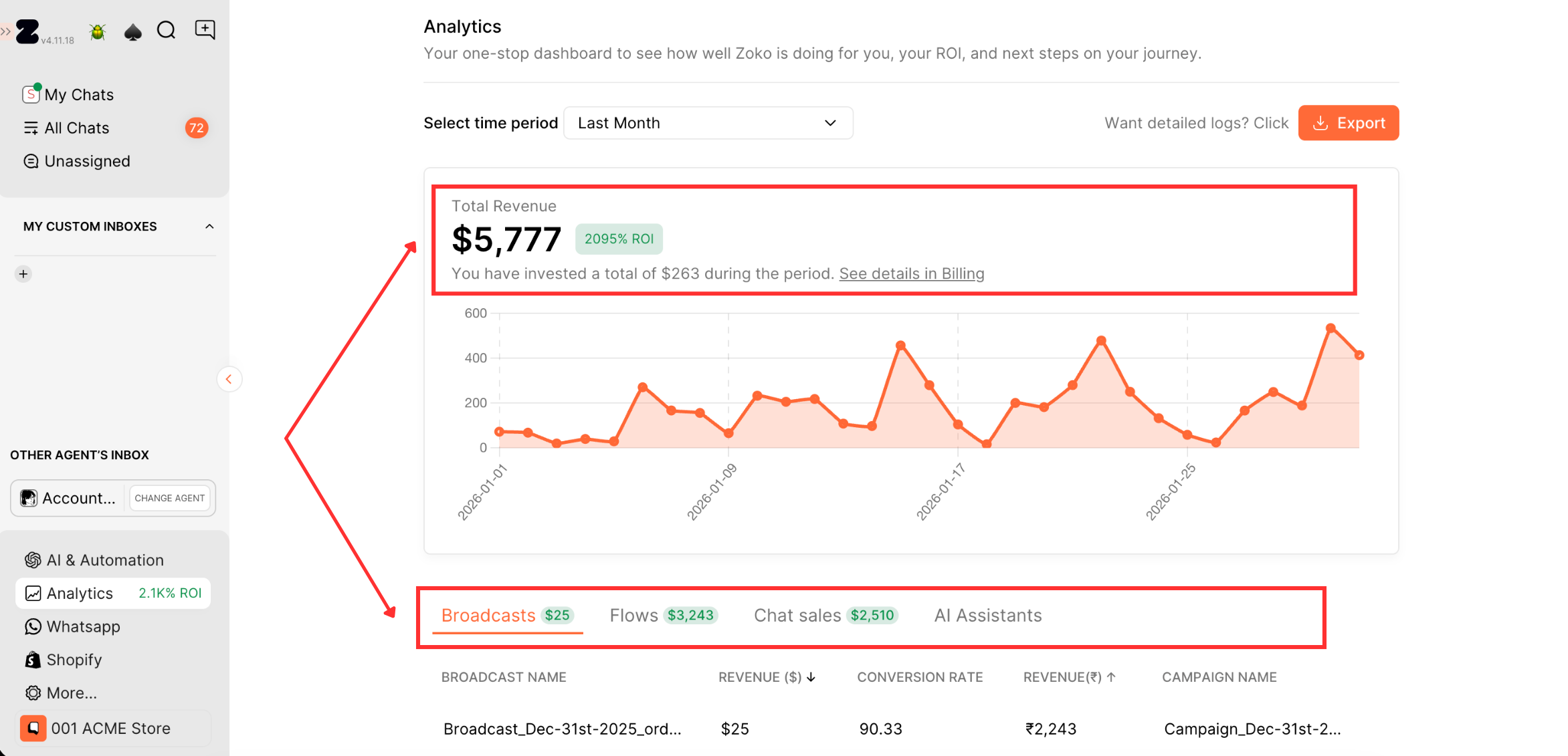 Pro Tip: You can export your Revenue Logs anytime by clicking Export. This helps you track how much revenue each feature contributes and clearly see the combined impact of all your activities including Chats, Broadcasts, Flows, and AI Assistants.